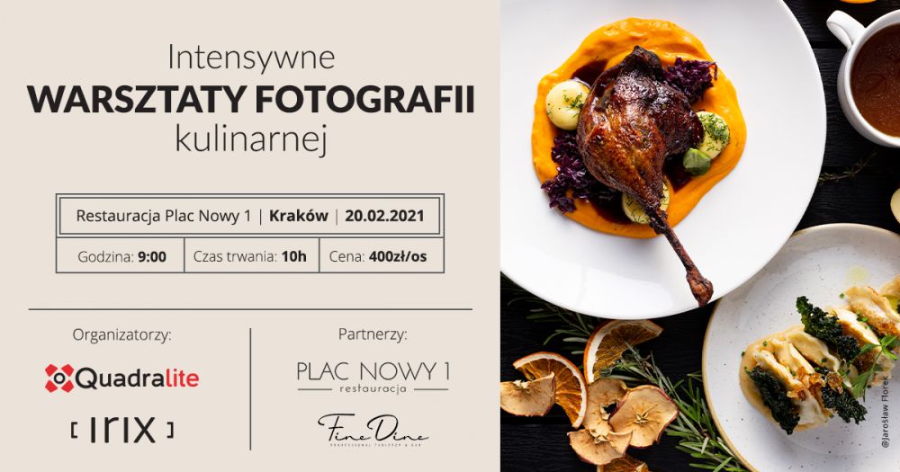 Firma Next77 oficjalny dystrybutor marek Irix oraz Quadralite zaprasza na wyjštkowe, intensywne warsztaty z fotografii kulinarnej, podczas których dowiecie się, jakie sš podstawowe aspekty wykonywania atrakcyjnych ujęć i stylizacji jedzenia. Aby móc wykorzystać pełnię możliwoœci sprzętu poznacie wiele zagadnień technicznych dotyczšcych ustawień aparatu i oœwietlenia w celu uzyskania profesjonalnych rezultatów robišc zdjęcia żywnoœci. Zapraszamy do spędzenia wyjštkowo produktywnych dziesięciu godzin w przepięknym wnętrzu krakowskiej restauracji Plac Nowy 1 zgłębiajšc tajniki fotografowania potraw i poznajšc proces powstawania wybranych dań!