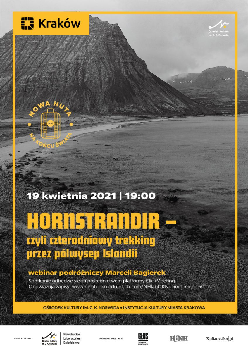 Webinar podróżniczy Marceli Bagierek w ramach cyklu Nowa Huta na końcu wiata. Tym razem udamy się do Hornstrandir rezerwatu i półwyspu położonego w północnej częci Fjordów Zachodnich w Islandii. Wstęp wolny, obowišzujš zapisy.