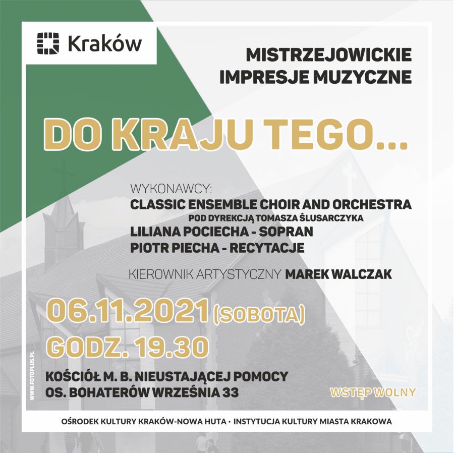 Z okazji przypadajšcej w tym roku dwusetnej rocznicy urodzin Czwartego Wieszcza, Sejm RP ogłosił rok 2021 rokiem Cypriana Kamila Norwida. Organizatorzy Mistrzejowickich Impresji Muzycznych: Rada Dzielnicy XV Mistrzejowice, Oœrodek Kultury Kraków-Nowa Huta oraz Parafia Matki Bożej Nieustajšcej Pomocy pragnš wpisać się w te obchody i zaprosić do medytowania poezji tego wybitnego polskiego twórcy w ramach koncertu „Do kraju tego…”, który odbędzie się 6 listopada 2021 r. o godz. 19.30 w Koœciele MB Nieustajšcej Pomocy (os. Bohaterów Wrzeœnia 33).