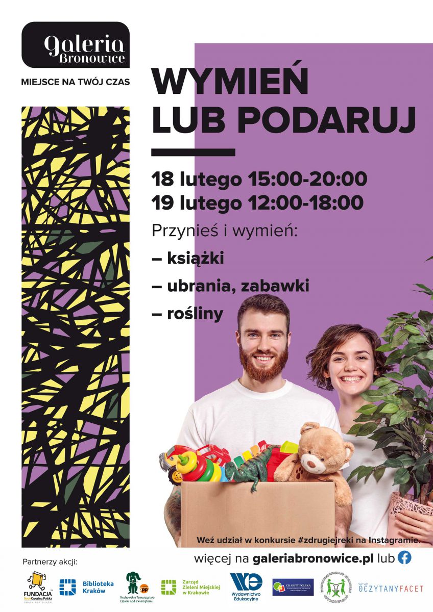 Wystarczy wzišć udział w akcji „Wymień lub podaruj” i w dniach 18-19 lutego przynieœć do Galerii Bronowice niepotrzebnš już odzież, zabawki, ksišżki czy roœliny. Wydarzenie odbędzie się w pištek w godz. 15:00 – 20:00, a także w sobotę w godz. 12:00 – 18:00 na parterze centrum handlowego. Za każdš przyniesionš rzecz otrzymamy żeton uprawniajšcy do wymiany na innš, znajdujšcš się w przestrzeni stoisk wymiany. Pamiętajmy, żeby przyniesione rzeczy były czyste, niezniszczone - takie, które sami chętnie zabralibyœmy do domu.