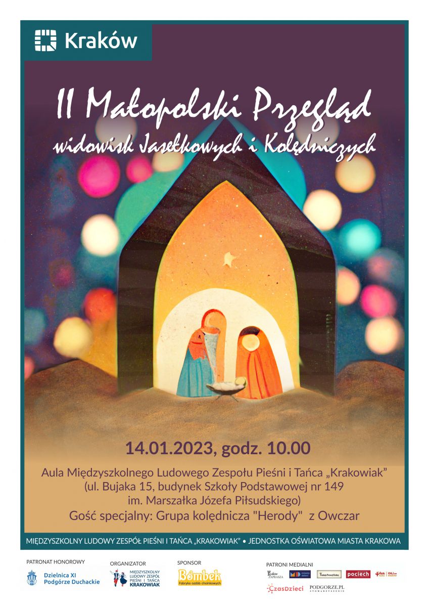 Międzyszkolny Ludowy Zespół Pieśni i Tańca „Krakowiak” zaprasza dzieci z przedszkoli, a także szkół podstawowych z naszego regionu na II Małopolski Przegląd Widowisk Jasełkowych i Kolędniczych. Podczas trwania wydarzenia zaprezentowane zostaną jasełka, a także widowiska kolędnicze. Na scenie pojawić się mogą zatem Herody, Droby, Szczodroki i inne zwyczaje, jak również obrzędy przypisane okresowi Bożego Narodzenia. Zapowiada się zatem barwne i niecodzienne spotkanie!