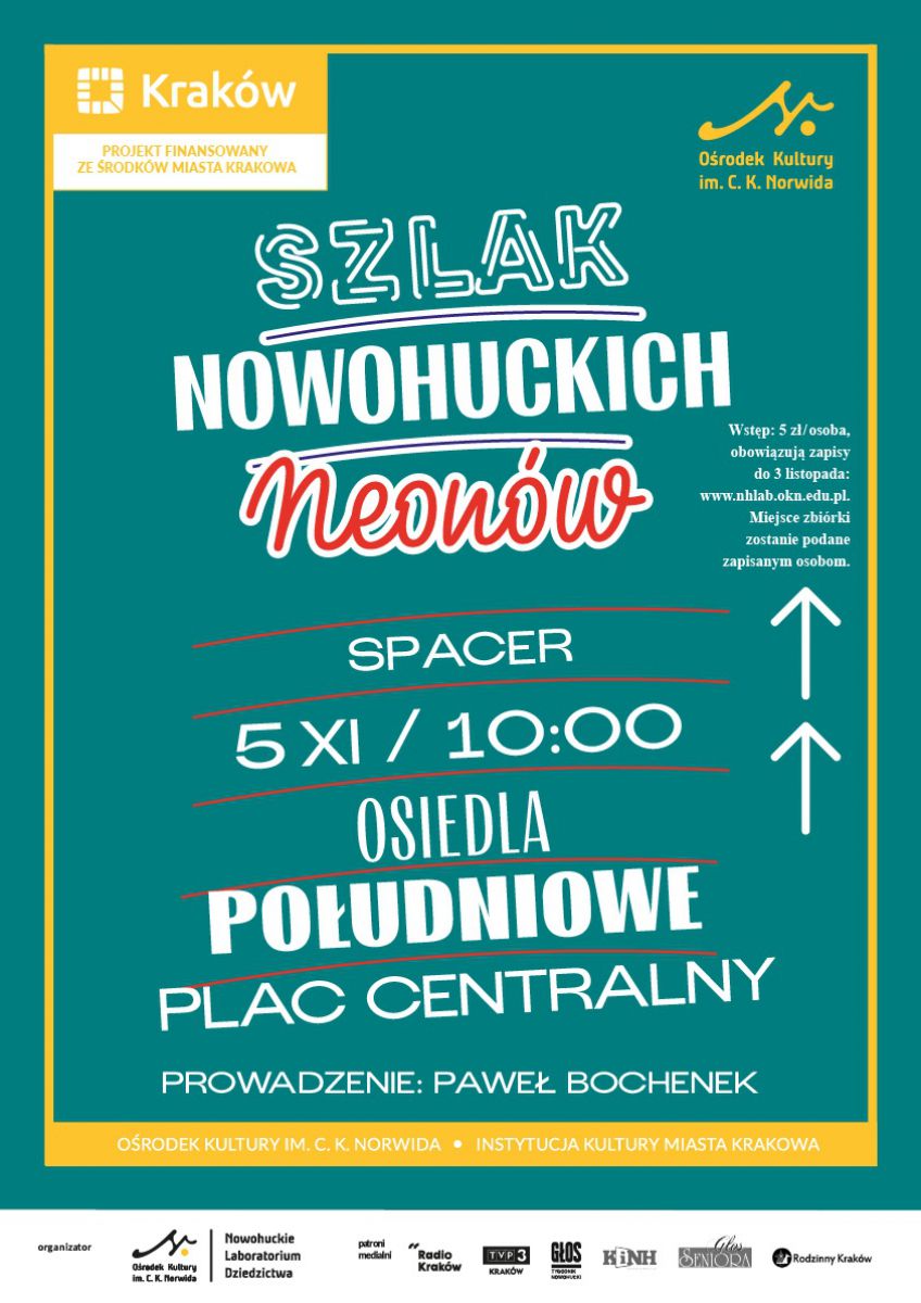 Szlak nowohuckich neonów – projekt przypominający neonowe dziedzictwo Nowej Huty. Jego realizację rozpocznie kwerenda, w efekcie której powstanie lista podstawowych informacji nt. nowohuckich neonów wraz z ich lokalizacjami. Na tej podstawie wytyczony i opracowany zostanie szlak z bardziej szczegółowymi opisami neonów: historycznych istniejących, historycznych nieistniejących, historycznych zrekonstruowanych i współczesnych. Przeprowadzony zostanie też zogniskowany wywiad grupowy z mieszkańcami i aktywistami nt. przyszłości neonowego dziedzictwa, trzy spacery po nowohuckich neonach oraz warsztaty projektowania neonów dla dzieci i dorosłych. Opracowany zostanie krój pisma odwołujących się do liternictwa nowohuckich neonów oraz przykładowe wizualizacje nowych neonów w przestrzeni publicznej z jego wykorzystaniem. Efekty zostaną podsumowane w publikacji w wersji drukowanej i online, zawierającej dodatkowo teksty o genezie i przyszłości neonowego dziedzictwa Nowej Huty.