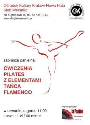 Klub Wersalik Orodka Kultury Kraków-Nowa Huta (os. Ogrodowe 15, 12 644 13 52, wersalik@krakownh.pl) zaprasza wszystkie panie na Ćwiczenia pilates z elementami tańca flamenco. Zajęcia skierowane sš do pań, które chcš zrobić co dla swojego samopoczucia i figury oraz nauczyć się czego nowego. Gwarantujemy zajęcia pod okiem wykwalifikowanego instruktora, który nauczy, jak z tańca czerpać nie tylko przyjemnoć ale i korzyci dla zdrowia i urody.