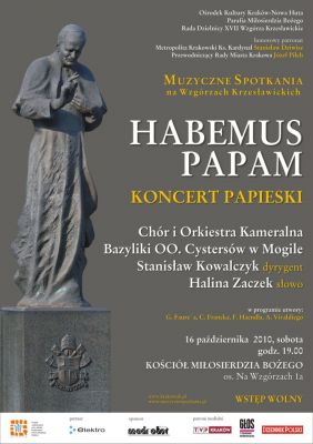 Orodek Kultury Kraków-Nowa Huta, Parafia Miłosierdzia Bożego oraz Rada Dzielnicy XVII Wzgórza Krzesławickie zapraszajš na kolejny koncert z cyklu Muzyczne Spotkania na Wzgórzach Krzesławickich. W programie Koncertu Papieskiego usłyszymy utwory: G. Faure´a, C. Francka, F. Haendla oraz A. Vivaldiego. Poezję Karola Wojtyły czytać będzie Halina Zaczek.