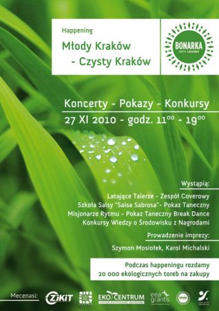 Happening w Bonarce odbywa się w ramach projektu Czysty Kraków Lepsze Życie podnoszenie wiadomoci oraz wiedzy mieszkańców w zakresie ochrony rodowiska i gospodarki odpadami. W trakcie imprezy, by podkrelić wagę dbania o rodowisko, promowane będš torby na zakupy wielokrotnego użytku. Rozdanych zostanie 20 000 sztuk toreb ekologicznych wraz z broszurami tematycznymi, dotyczšcymi utrzymania czystoci i gospodarowania odpadami w Krakowie. Zainteresowani odbiorš je u wolontariuszy ze Stowarzyszenia SIEMACHA. Będzie ich można poznać po specjalnych koszulkach z hasłem happeningu: Młody Kraków Czysty Kraków.