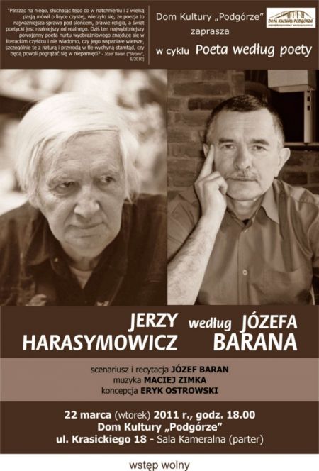 Jerzy Harasymowicz według Józefa Barana to kwietniowa propozycja nowej formuły popularnego cyklu literackiego Dlatego Klasycy, organizowanego od kilku lat prze poetę i pisarza Eryka Ostrowskiego. Ideš spotkań jest przedstwaienie twórczoœci poetów starszej generacji przez wspólczesnych twórców literatury. W najblizszy wtorek Józef Baran opowie o wierszach swojego poety-mistrza - Jerzego Harasymowicza. Prezentacje utworów dopełni komentarz Józefa Barana oraz jego własne wiersze wchodzšce w dialog z mistrzem.