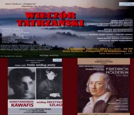 5 kwietnia krakowski Dom Kultury Podgórze goœcić będzie niecodzienny wieczór artystyczny z udziałem z udziałem: Marzeny Dšbrowy-Szatko, Eryka Ostrowskiego, Zbigniewa Ostrowskiego, Anny Skoczylas, Krystyny Szlagi oraz Elżbiety Zechenter-Spławińskiej. W programie wieczoru przewidziane jest prezentacja poezji oraz prozy poœwięconej Tatrom, dyskusja o roli, tematyki górskiej w sztuce, rozmowy z twórcami oraz prezentacje plastyczne w tym wystawa tatrzańskich obrazów Krystyny Szlagi. Podczas spotkania będzie miała miejsce premiera ksišżek : "Pokłoń się Tatrom. Antologia wierszy tatrzańskich", "Kazimierz Przerwa-Tetmajer Ciche, mistyczne Tatry" oraz "Adam Asnyk Poemat natury. Wiersze tatrzańskie" .