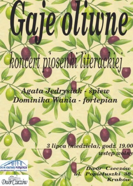 Już w najbliższš niedzielę 3 lipca Dwór Czeczów zaprasza na koncert „Gaje oliwne” - muzyczne aranżacje utworów poetyckich Grażyny Jaœkiewicz – Steranko œpiewane przez Agatę Jędrysiak. Wokalistka jest laureatkš Festiwalu Twórców Polskiej Piosenki we Wrzeœni, Olsztyńskich Spotkań Zamkowych i Festiwalu Twórczoœci Marka Grechuty w Krakowie. Jej piosenki nawišzujš do obrazów wybitnych malarzy między innymi Józefa Mehofera. Muzykę komponowała Jaga Olesińska, przez wiele lat zwišzana z zespołem ANAWA Marka Grechuty.