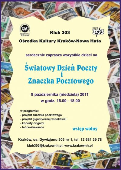 Klub 303 Orodka Kultury Kraków Nowa Huta (os. Dywizjonu 303) zaprasza dzieci z rodzicami na obchody wiatowego Dnia Poczty i Znaczka Pocztowego.