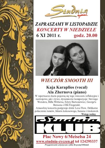 W repertuarze duetu pojawi si tego wieczoru refleksyjne i nastrojowe, jak i ywe, dynamiczne kompozycje: Steviego Wondera, Billa Withersa, Edyty Bartosiewicz, George'a Bensona i Elli Fitzgerald.
