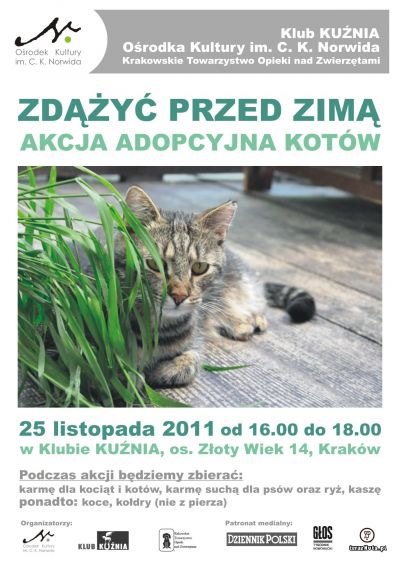 Klub KUNIA Oœrodka Kultury im. C. K. Norwida oraz Krakowskie Towarzystwo Opieki nad Zwierzętami zapraszajš na AKCJĘ ADOPCYJNĽ KOTÓW – ZDĽRZYĆ PRZED ZIMĽ. Podczas akcji odbędzie się zbiórka karmy dla kotów, karmy suchej dla psów, kaszy, ryżu oraz koców i kołder (nie z pierza) dla podopiecznych schroniska dla bezdomnych zwierzšt przy ul Rybnej. Wszystkie koty przeznaczone do adopcji posiadajš ksišżeczki zdrowia i aktualne szczepienia. Każdy, kto przyjdzie adoptować kotka musi mieć ze sobš przenoskę lub koszyk, w którym zabierze kotka do domu.