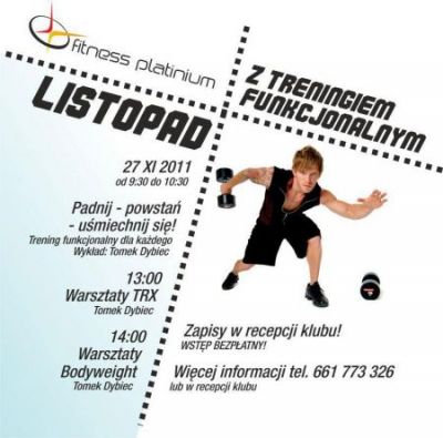 27 listopada 2011 r. (niedziela) odbędš się warsztaty z TRX i Bodyweight. Po wykładzie o godzinie 9.30 na temat ogólnych zasad treningu funkcjonalnego o 13.00 zostanie przybliżona metoda TRX, polegajšca na wykorzystaniu w treningu obcišżenia własnego ciała oraz specjalnych lin. Jego zastosowanie wpływa na elastycznoć i równowagę oraz siłę, a także skutecznie zapobiega urazom. Godzinę póniej instruktorzy omówiš i zaprezentujš Bodyweight kolejny trening bazujšcy na wykorzystaniu obcišżenia własnego ciała. Jest on jednak znacznie krótszy, ale intensywniejszy i bardziej zróżnicowany.