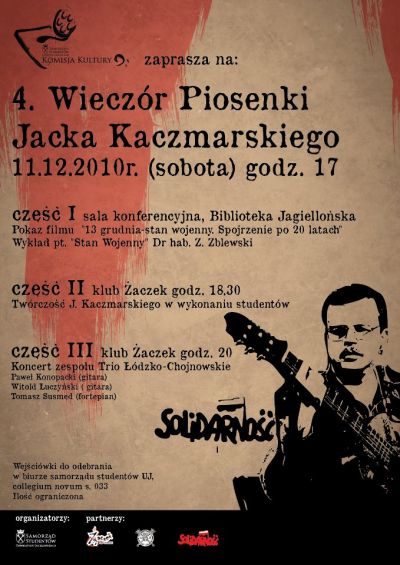 Samorzšd Studentów Uniwersytetu Jagiellońskiego po raz kolejny zaprasza na wyjštkowe spotkanie z twórczoœciš niesamowitego poety, tekœciarza i piosenkarza Jacka Kaczmarskiego podczas kolejnej edycji Wieczoru Piosenki Jacka Kaczmarskiego.