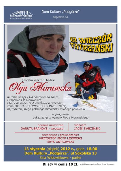 W ramach Podgórskiej Sceny Poezji goœciem wieczoru będzie Olga Morawska autorka ksišżek : Od poczštku do końca (wspólnie z P. Morawskim) i Góry na opak, czyli rozmowy o czekaniu, żona Piotra Morawskiego (1976 – 2009), polskiego himalaisty młodego pokolenia.