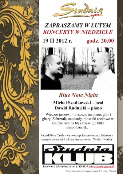 Wieczr jazzowo- blusowy: na piano, gos i gitar. Zabrzmi standardy, piosenki rockowe w aranacjach na bkitn nut i kilka niespodzianek