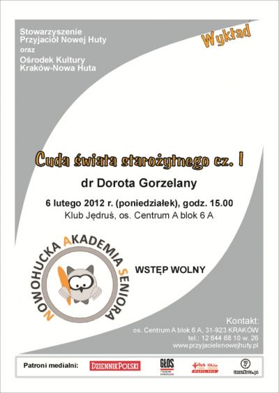 Stowarzyszenie Przyjaciół Nowej Huty oraz Oœrodek Kultury Kraków-Nowa Huta zapraszajš do Nowohuckiej Akademii Seniora na prelekcję dr Doroty Gorzelany, poœwięconš najznakomitszym budowlom œwiata. Uczestnikom spotkania zostanie zaprezentowana historia powstania wybranych cudów œwiata starożytnego: piramidy Cheopsa, latarni morskiej w Aleksandrii, wiszšcych ogrodów Semiramidy w Babilonie, ich znaczenie i kontekst kulturowy, możliwoœci techniczne i architektoniczno – rzeŸbiarskie ówczesnego œwiata oraz okolicznoœci zniszczenia częœci z nich.