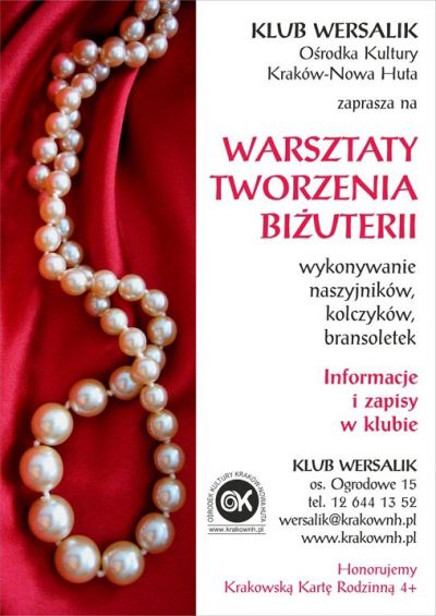 Serdecznie zapraszamy na kolejne warsztaty tworzenia biuterii do Klubu Wersalik. Tym razem tematem zaj bdzie biuteria z rzemienia i ceramiki. Informacje i zapisy w Klubie (12 644 13 52).