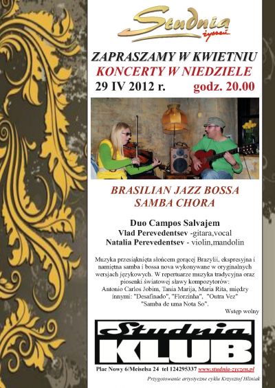 Muzyka przesiknita socem gorcej Brazylii, ekspresyjna i namitna samba i bossa nova wykonywane w oryginalnych wersjach jzykowych. W repertuarze muzyka : Antonio Carlos Jobim, Tania Marija, Maria Rita,