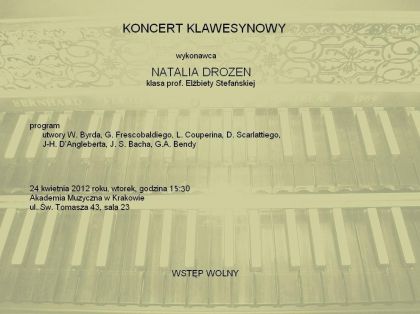 Natalia Drozen studia licencjackie i magisterskie w klasie prof. Leszka Kędrackiego w Akademii Muzycznej w Łodzi ukończyła z wyróżnieniem. Od wrzeœnia 2010 do marca 2011 roku w ramach programu stypendialnego Erasmus studiowała w Hochschule der Künste in Bern (Szwajcaria) w klasie klawesynu prof. Dirka Börnera. Brała udział w licznych kursach mistrzowskich prowadzonych m.in. przez: Nicholasa Parle, Tineke Steenbrink, Elżbietę Stefańskš, Liliannę Stawarz, Marcina Szelesta i Ewę Mrowca- Koœciukiewicz (realizacja basso continuo) oraz Marię Erdman (klawikord), a także w warsztatach tańca barokowego prowadzonych przez Romanę Agnel, Dariusza Brojka i Magdalenę Żmudę. Uczestniczyła w festiwalach, takich jak: 17. Dni Bachowskie, XV Festiwal Muzyka w Sandomierzu (koncert z towarzyszeniem Leopolis Chamber Orchestra), II Międzynarodowy Festiwal Muzyki Dawnej im. Julitty Sleńdzińskiej w Białymstoku i Wędrowny Festiwal Filharmonii Łódzkiej – Kolory Polski XII oraz sesjach artystyczno-naukowych jak Musica Moderna, Taniec w Muzyce Baroku oraz Haendel 250 (koncert- „Ody Haendla” pod dyrekcjš Lilianny Stawarz). Stypendystka Ministra Kultury i Dziedzictwa Narodowego w roku 2010/2011. Podczas I-go Akademickiego Konkursu Klawesynowego w Poznaniu otrzymała Nagrodę Rektora Akademii Muzycznej we Wrocławiu. Stypendystka Académie musicale de Villecroze (Francja) w klasie klawesynu i klawikordu Iltona Wjuniskiego w roku 2011. Od lutego bieżšcego roku kontynuuje naukę na Studiach Podyplomowych w Akademii Muzycznej w Krakowie w klasie klawesynu prof. Elżbiety Stefańskiej.