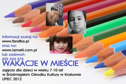 Serdecznie zapraszamy najmłodszych do wspólnej zabawy na przedpołudniowe zajęcia do Œródmiejskiego Oœrodka Kultury w Krakowie! W trakcie warsztatów, pod okiem profesjonalnych animatorów zabaw oraz pedagogów będziemy podróżować w różne, magiczne miejsca, nie wyjeżdżajšc z miasta! Wszystkie szczegóły znajdujš się na naszej stronie internetowej. Do Państwa dyspozycji numer telefonu, gdzie można spytać o miejsce na wakacyjnych warsztatach dla dzieciaków.