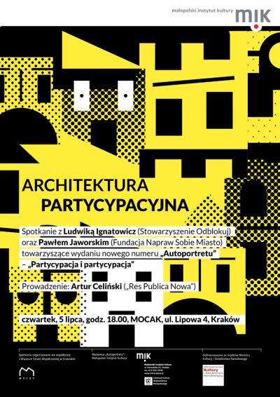 Małopolski Instytut Kultury zaprasza na spotkanie powięcone architekturze partycypacyjnej, które odbędzie się 5 lipca 2012 r. w krakowskim MOCAKU. Spotkanie poprowadzi Artur Celiński (Res Publica Nowa). Do udziału w rozmowie zaproszono Ludwikę Ignatowicz ze Stowarzyszenia Odblokuj, która będzie się dzielić dowiadczeniami z praktycznej realizacji postulatu włšczania mieszkańców w proces projektowania, oraz Pawła Jaworskiego, teoretyka i praktyka uczestnictwa, członka Fundacji Napraw Sobie Miasto. Uczestnicy spotkania będš rozmawiać o tym, w jaki sposób mieszkańcy mogš czy powinni być włšczani w obręb procesu projektowania na kolejnych jego etapach. Będš się także zastanawiać nad politycznymi i społecznymi implikacjami procesu partycypacyjnego; nad zagrożeniami, jakie może w sobie nieć opacznie rozumiane uczestnictwo; wreszcie nad konsekwencjami, jakie wynikałyby z realizacji rozmaicie pojmowanych koncepcji partycypacji dla obrazu współczesnych miejskich przestrzeni.