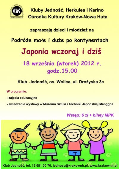 Klub Jednoœć Oœrodka Kultury Kraków-Nowa Huta (ul. Drożyska 3c) zaprasza na zajęcia Japonia wczoraj i dziœ, które odbędš się 18 wrzeœnia 2012 r. (wtorek) o godz. 15.00.