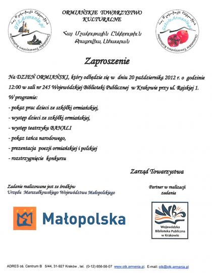 Zapraszamy na Dzień Ormiański, który odbędzie się w Wojewódzkiej Bibliotece Publicznej - sala 245, w dniu 20 paŸdziernika 2012 roku.