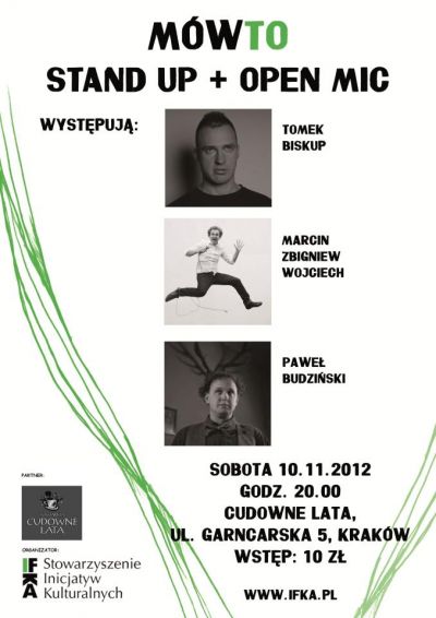 Tym razem spotykamy się w niezwykłej kawiarni Cudowne Lata, a swoje STAND UP'owe programy zaprezentujš Wam Tomek Biskup, Marcin Zbigniew Wojciech. Artyci na co dzień występujš w całej Polsce jako członkowie Kabaretów "PUK", "Chwilowo Kaloryfer" oraz Grupy Improwizacyjnej Ad Hoc. Dodatkowo, na scenie zaprezentuje się Paweł Budziński, który włanie- z wielkim hukiem- wkracza na krakowskie salony