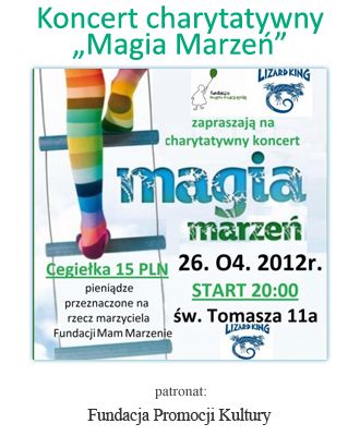 Ambasador Małgorzata Kożuchowska oraz wolontariusze Fundacji Mam Marzenie zapraszają na koncert charytatywny „Magia Marzeń”, który odbędzie się 26 kwietnia 2012 roku w klubie Lizard King w Krakowie, przy ul. Św. Tomasza 11a.