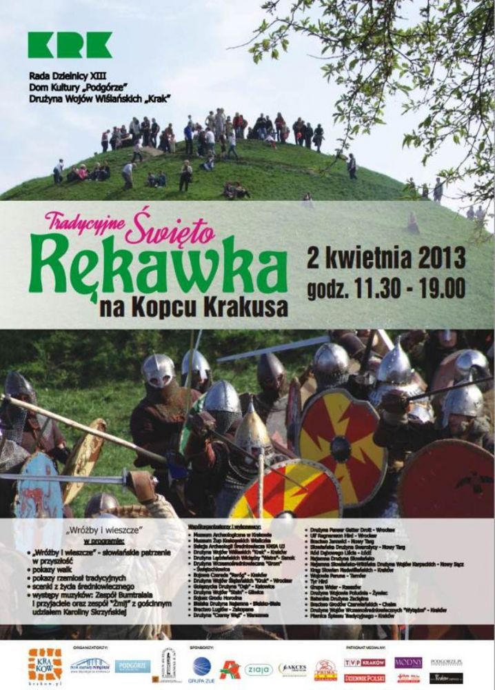 Obchodzone od wieków Święto Rękawki od roku 2001 odbywa się pod Kopcem Krakusa. Impreza ma charakter średniowiecznego festynu, gdzie prezentowane są pokazy walk i uzbrojenia. W roku 2013 tematem przewodnim imprezą są zwyczaje Słowian, więc będzie można obejrzeć m.in wesele słowiańskie z wróżbami pomyślności, wiedźmy wróżące, tańce wieszczek czy rekonstrukcję świątyni przedchrześcijańskiej (Kącina – chram słowiański).