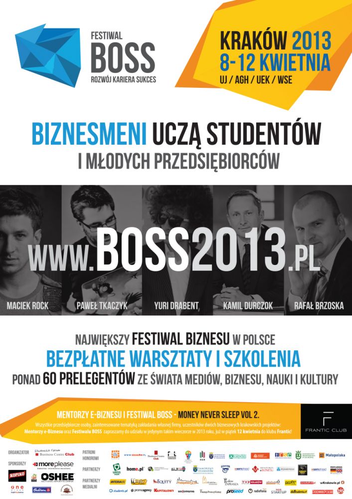 8 - 12 kwietnia w aulach największych krakowskich uczelni rusza X edycja Festiwalu BOSS. Podczas krakowskiej odsłony zobaczycie liderów polskiego biznesu. Na Festiwalu BOSS wystąpią również znani prezenterzy telewizyjni: Kamil Durczok i Maciek Rock.