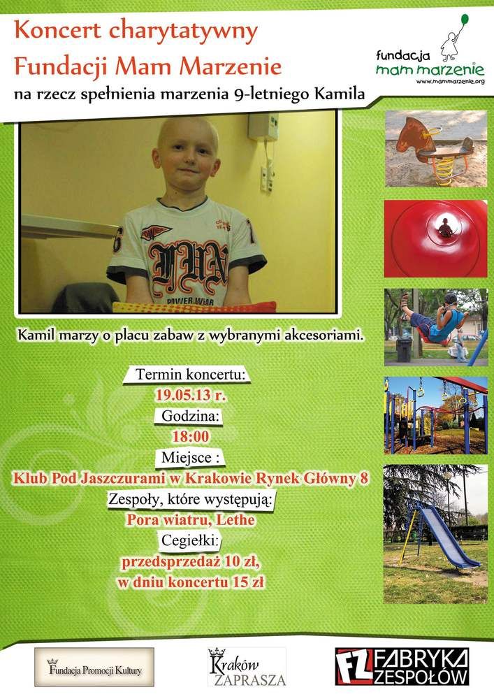 19 maja w Klubie Pod Jaszczurami w Krakowie odbędzie się koncert charytatywny Fundacji Mam Marzenie. Podczas imprezy zagrają dwa krakowskie zespoły: Pora Wiatru i Lethe. Dochód ze sprzedaży cegiełek zostanie przeznaczony na spełnienie marzenia 9-letniego Kamila, który chciałby plac zabaw ze zjeżdżalnią rurą, ścianką wspinaczkową, workiem bokserskim i wieloma innymi dodatkami.