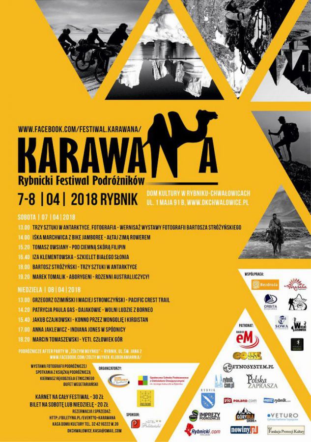 7-8 kwietnia 2018 r. Rybnicki Festiwal Podróżników KARAWANA Dom Kultury w Rybniku-Chwałowicach Rybnik, ul. 1 Maja 91B godz. 13:00