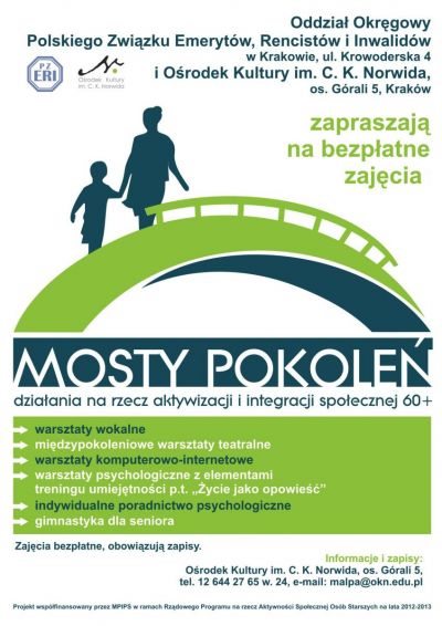 Ośrodek Kultury im. C. K. Norwida oraz Polski Związek Emerytów, Rencistów i Inwalidów - Oddział Okręgowy w Krakowie zapraszają seniorów (60+) do aktywnego udziału w zajęciach w ramach nowego projektu „Mosty pokoleń”. Projekt realizowany będzie do czerwca 2013 w Krakowie. W ramach projektu przygotowano m.in. warsztaty wokalne, psychologiczne, międzypokoleniowe warsztaty teatralne. Udział w zajęciach jest bezpłatny.