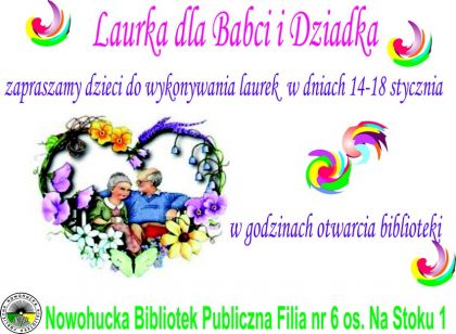 W cyklu: "Spotkajmy się w bibliotece" zapraszamy na zajęcia plastyczne. Dzieci będą wykonywać laurki na Dzień Babci i Dzień Dziadka. Biblioteka zapewnia materiały plastyczne.