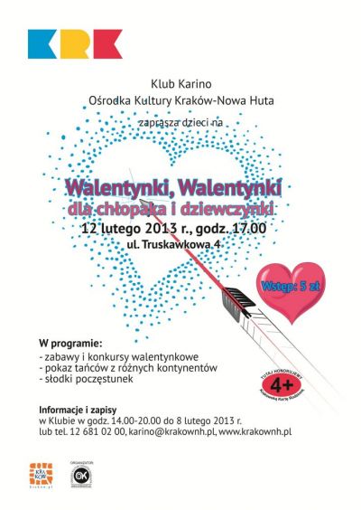 Klub Karino Ośrodka Kultury Kraków-Nowa Huta (ul. Truskawkowa 4) zaprasza dzieci na walentynkowy blok zabaw i konkursów oraz pokaz tańców z różnych kontynentów.