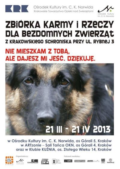21 marca odbędzie się zbiórka karmy i rzeczy dla psów i kotów z krakowskiego Schroniska dla Bezdomnych Zwierząt przy ulicy Rybnej 3. W tym dniu w Ośrodku Kultury im. C.K.Norwida, os. Górali 5 oraz w Klubie „Kuźnia” OKN, os. Złotego Wieku 14 zbierana będzie karma dla psów i kotów, ryż, kasza oraz rzeczy takie jak koce, kołdry (nie z pierza).