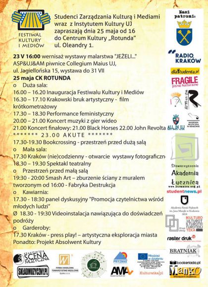 Już w tę sobotę (25.05) Festiwal Kultury i Mediów organizowany przez studentów Instytutu Kultury UJ. Zapraszamy na wielki finał podczas którego zagrają: