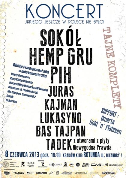 Są to przedstawiciele "pierwszej ligi" polskiego hip-hopu, posiadacze wielu złotych i platynowych płyt.. W tym samym czasie na dolnej Sali Rotundy odbędzie się wystawa przygotowana przez Instytut Pamięci Narodowej. Będą rozdawane różnego typu materiały edukacyjne przygotowane również przez IPN-m.in. plakaty, płyty czy wspaniałe puzzle(np. wieloelementowa układanka "Piłsudski Na Kasztance"). Zysk ze sprzedaży owych produktów wesprze akcję "Rodacy Bohaterom"- prowadzoną już drugi rok akcję pomocy kombatantom Armii Krajowej zamieszkujących Litwę, Łotwę, Ukrainę i przede wszystkim Białoruś. Dodatkowo w dolnej sali będzie się znajdować siedząca widownia, ekran wraz z nagłośnieniem. Dzięki temu będzie i tam można oglądać bezpośrednią transmisję koncertu z sali głównej.