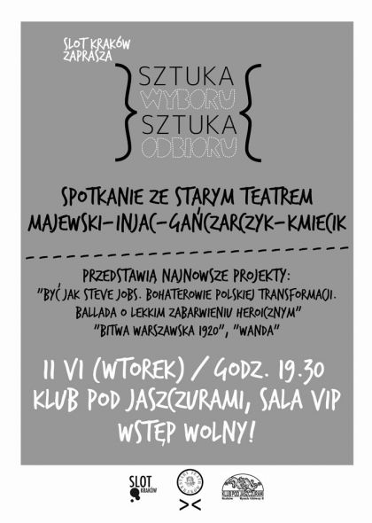 Cykl spotkań SZTUKA WYBORU – SZTUKA ODBIORU pod szyldem SLOT Kraków jest rozwinięciem SLOT Festów, które odbywają się co pół roku, skupiając na wspólnej przestrzeni nieprzebraną ilość tematów i form, a także wielu niezwykłych gości. Ponieważ podczas takiego weekendu często nie sposób uczestniczyć we wszystkich wydarzeniach ani skupić się dłużej na jednym temacie, chcemy spotykać się częściej i wnikać głębiej w wybrane tematy.