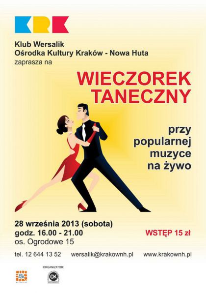 Klub Wersalik Ośrodka Kultury Kraków-Nowa Huta (os. Ogrodowe 15) zaprasza na wieczorek taneczny przy popularnej muzyce na żywo, który odbędzie się 28 września w godz. 16.00-21.00.