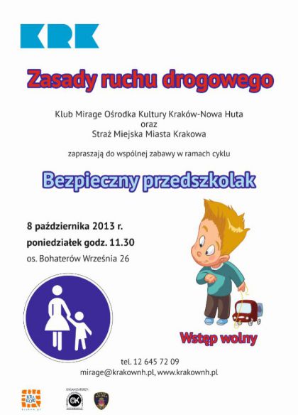 W trakcie zabawy dzieci zdobędą wiedzę na temat bezpiecznego poruszania się po drogach. Nabyte umiejętności wypróbują w trakcie zabaw edukacyjnych z funkcjonariuszami Straży Miejskiej, aby potem praktycznie korzystać z nich przez całe życie. Współorganizatorem cyklu jest Straż Miejska Miasta Krakowa.