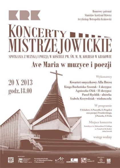 W ramach Koncertów Mistrzejowickich serdecznie zapraszamy do Kościoła pw. Św. M. M. Kolbego w Mistrzejowicach na koncert AVE MARIA W MUZYCE I POEZJI w wykonaniu kwartetu smyczkowego Alle Breve oraz aktorów: Barbary Szałapak i Andrzeja Franczyka.