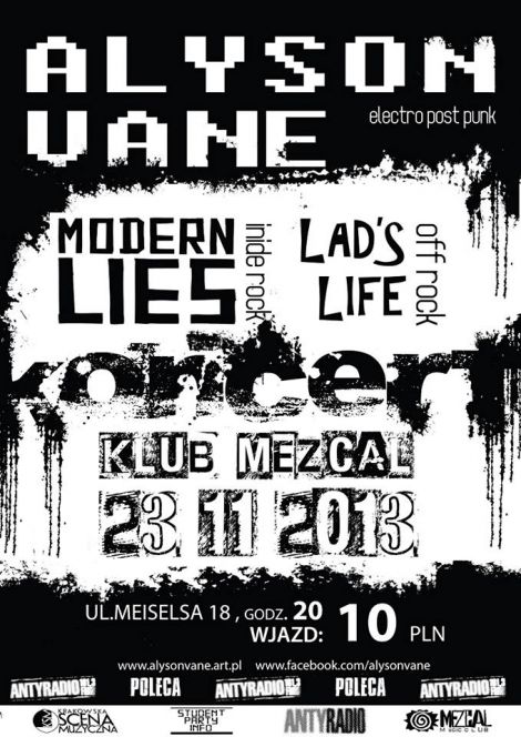 23 listopada w klubie Mezcal na Kazimierzu, trzy najlepsze zespoły alternatywnej sceny krakowskiej. Alyson Vane - hałaśliwa muzyka o nieszczęśliwej miłości podana w epileptyczno punkowych rytmach. Lad's Life - namiętny off-rock chłopaków i dziewczyny z byłego ex nieistniejącego już Mothers and the Fuckers. Modern Lies - zadają kłam temu, że jeśli zespół jest z krakowa, to musi grać artystyczne gówno, a ich muzyka wkręca się w zwoje mózgowe jak korkociąg w butelczynę chardonnay. Godzina nieprzyzwoita, więc ubierzcie się niestosownie i wpadajcie.