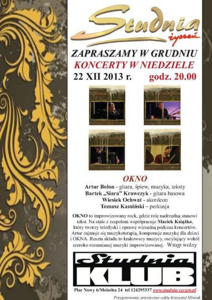 Artur zajmuje się muzykoterapią, komponuje muzykę dla dzieci i OKNA. Reszta składu to krakowscy muzycy, oscylujący wokół szeroko rozumianej muzyki improwizowanej. Wstęp wolny
