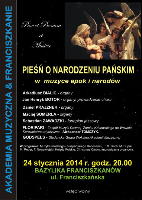 Akademia Muzyczna w Krakowie oraz Franciszkanie z Franciszkańskiej w Krakowie zapraszają na koncert "Pieśń o Narodzeniu Pańskim w muzyce epok i narodów", który odbędzie się w piątek, 24 stycznia o godzinie 20:00 w Bazylice Franciszkanów w Krakowie. Wstęp na koncert wolny! Serdecznie zapraszamy!