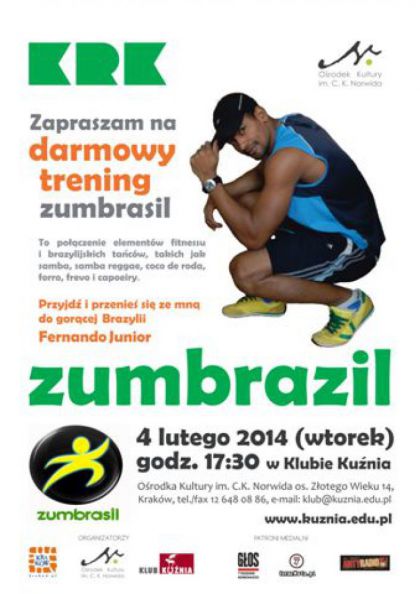 „Zapraszam na darmowy trening zumbrasil.Wyjątkowy, niepowtarzalny, jedyny taki w Krakowie. Przyjdź i przenieś się ze mną do gorącej Brazylii” - Fernando Junior