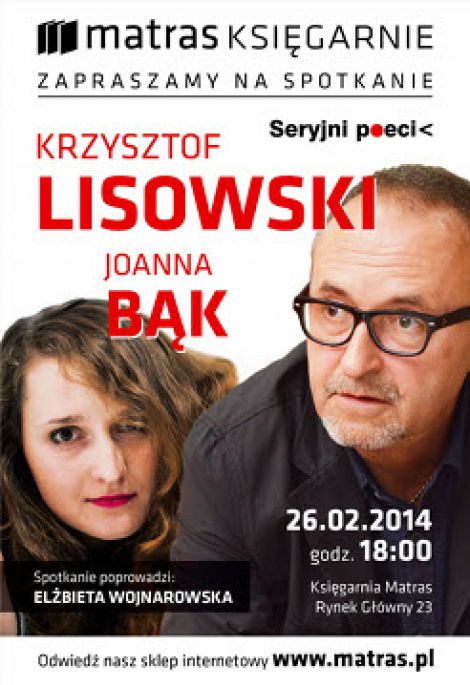 Księgarni Matras w Krakowie (Rynek Główny 23) – najstarszej księgarni w Europie, liczącej sobie 404 lata, odbędzie się kolejne spotkanie literackie z cyklu : „Mistrz i Uczeń”, a bohaterami wieczoru będzie : jako Mistrz – znakomity poeta Krzysztof Lisowski, oraz młoda poetka – Joanna Bąk.