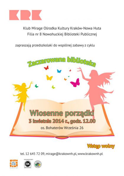 Klub Mirage Ośrodka Kultury Kraków-Nowa Huta (os. Bohaterów Września 26) zaprasza 3 kwietnia o godz. 12.00 na kolejne spotkanie dla przedszkolaków z cyklu Zaczarowana Biblioteka.