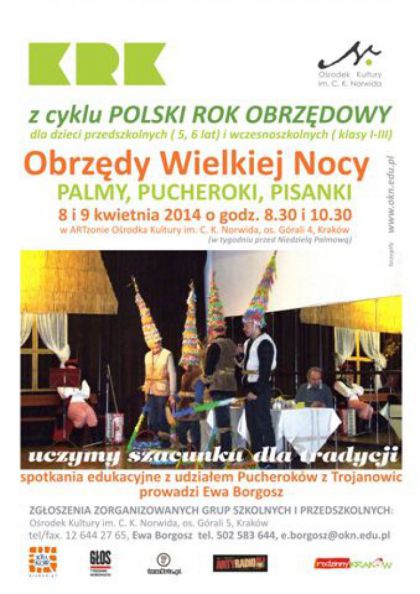 Serdecznie zapraszamy grupy szkolne (klasy 0 – III) i przedszkolne (5 i 6-cio latki) na imprezy - warsztaty , które odbędą się w ramach cyklu "Polski rok obrzędowy", we wtorek i środę 8 i 9 kwietnia 2014 (w tygodniu przed Niedzielą Palmową) o godz. 8.30 i 10.30 w ARTzonie ( dawnej Sali Tańca), os. Górali 4 w Krakowie.